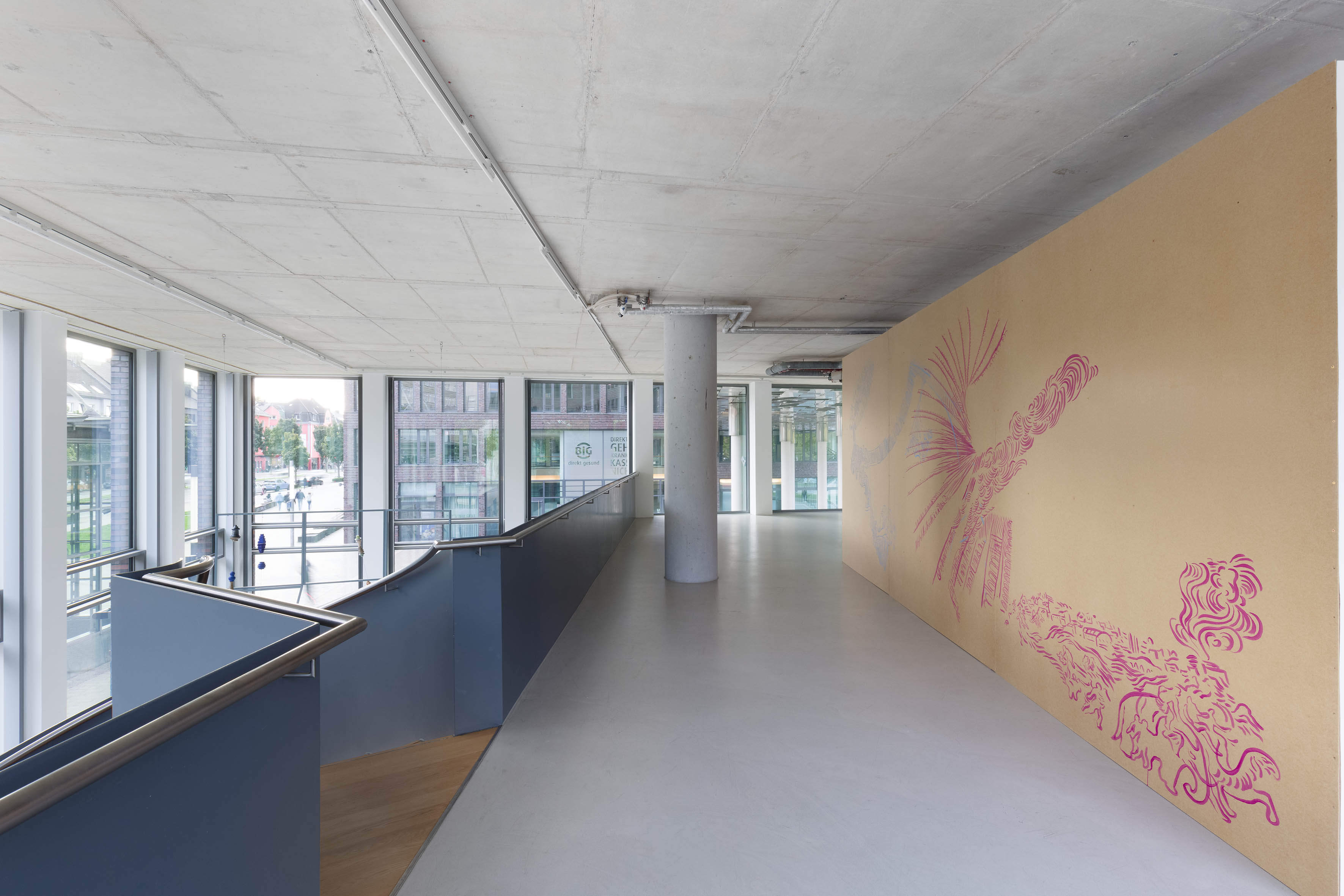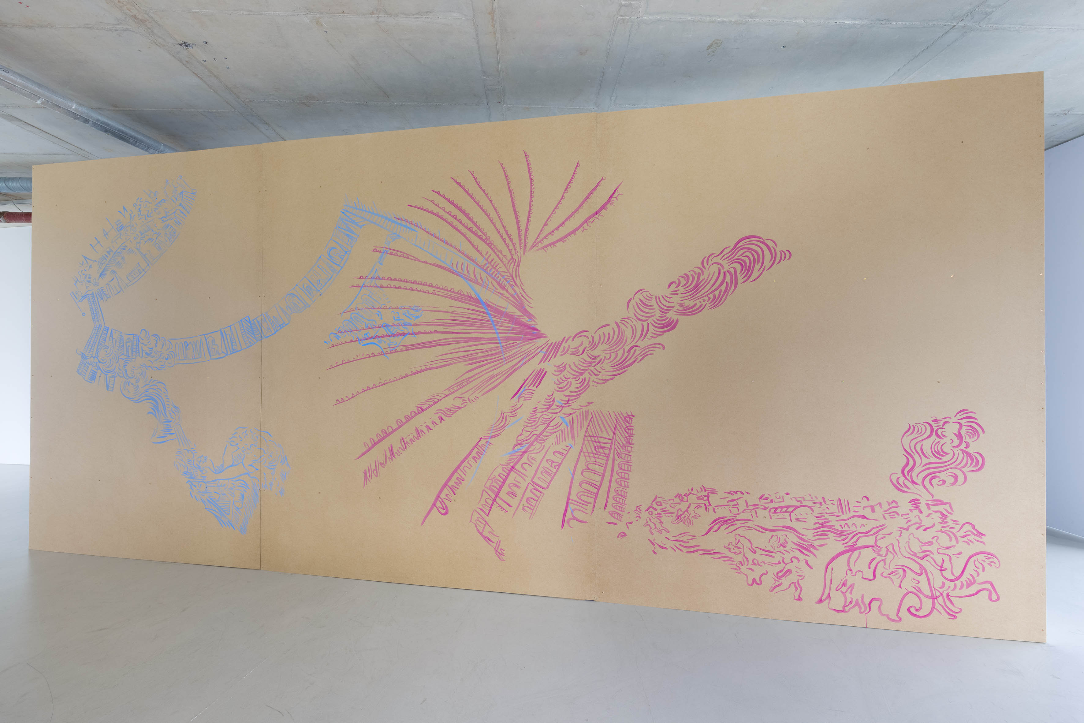 Ihre Ausstellung im Kunstverein präsentiert Zeichnungen und keramische Arbeiten, die die Zerbrechlichkeit und Instabilität menschlicher Existenz reflektieren: Mit handgefertigten Keramikperlen, eingefädelt in eine mäandernde modulare Architektur, verknüpft sie in ihrer Ausstellung Stringing Beads Parallelen zwischen handwerklichen Techniken und erzählerischen Prozessen, zwischen dem Auffädeln von Perlen und den Herausforderungen des menschlichen Zusammenhalts. Der Linearität dieser Zeiterfahrung stellt sie die rotierende Bewegung der Töpferscheibe gegenüber: Geschichte schreitet fort und wiederholt sich. Ihre neue Installation schafft so einen eigenen Kosmos, der Unterbrechungen und Abrisse bei der Weitergabe von Erzählungen thematisiert sowie die Kreisläufe von Aufbauen, Zusammenbrechen und Wiederaufbauen aus Fragmenten.