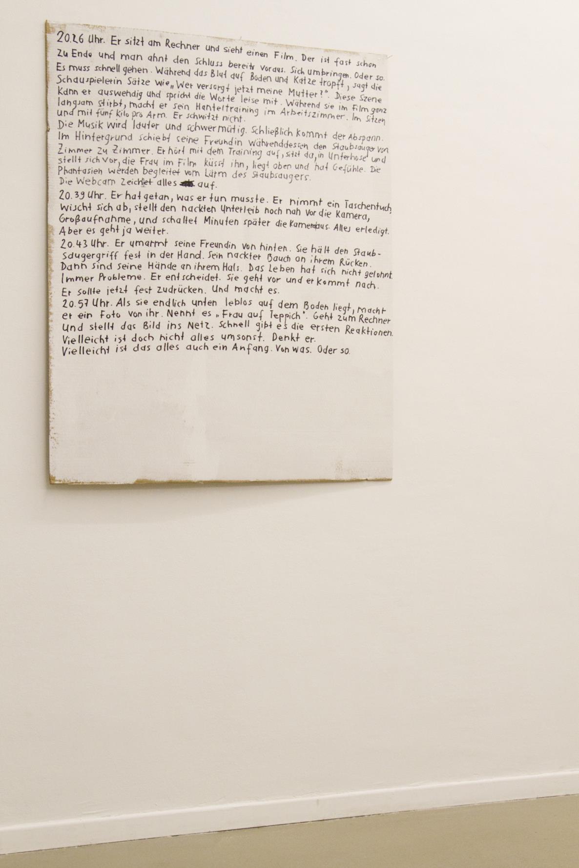 20.57 Uhr. Als sie endlich unten leblos auf dem Boden liegt, macht er ein Foto von ihr. Nennt es „Frau auf Teppich“. Geht zum Rechner und stellt das Bild ins Netz. Schnell gibt es die ersten Reaktionen. Vielleicht ist doch nicht alles umsonst. Denkt er. Vielleicht ist das alles auch ein Anfang. Von was. Oder so.