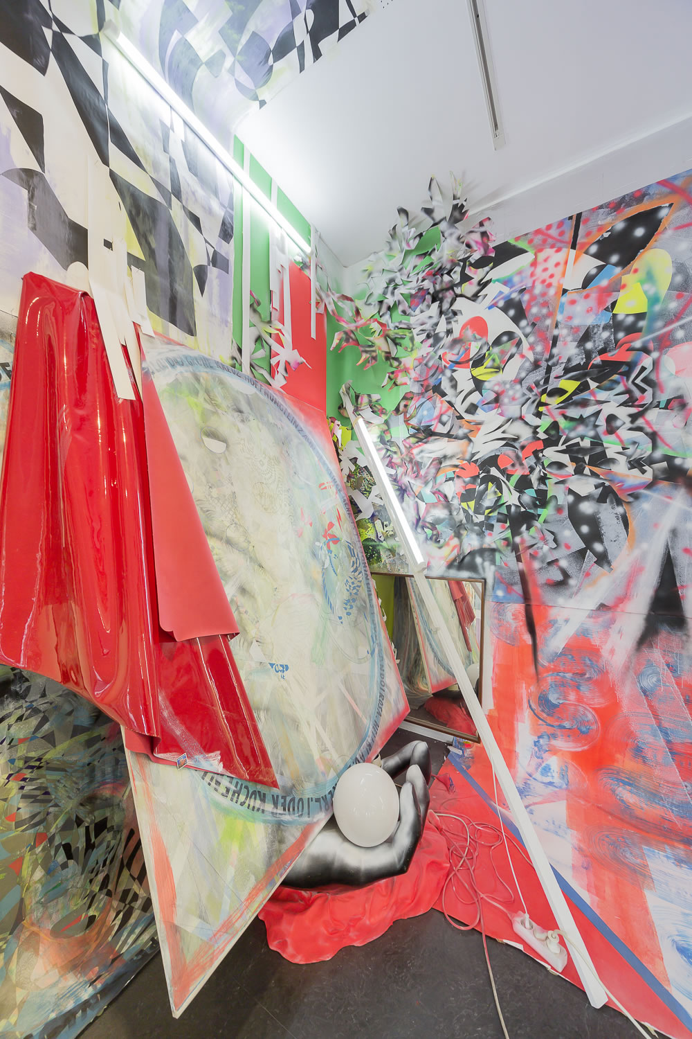 Durch collagenartige Aufbauten, spiegelnde Bestandteile und überdimensionale Neonröhrenelemente gefasst, aus großformatigen und starkfarbigen Zeichnungen, Malereien, Farbflächen, handelsüblichen Tapeten und Industriematerialien als offene, grell aufgeladene Bildwelten präsentieren sich ihre Werke: Voll von Anspielungen, lesbar und zugleich auch nicht lesbar, statisch und bewegt, flächig und räumlich, digital und analog, scheinbar fröhlich und doch voll Trauer. Schrift und Inhalt, ornamental genutzt, erzeugen Analogien, die vom Rezipienten entwickelt und vervollständigt werden. Plakativität von Formen und Inhalten wird von Zartheit gerahmt und harte Kontraste neben verletzte, missbrauchte Bilder und Texte gesetzt.