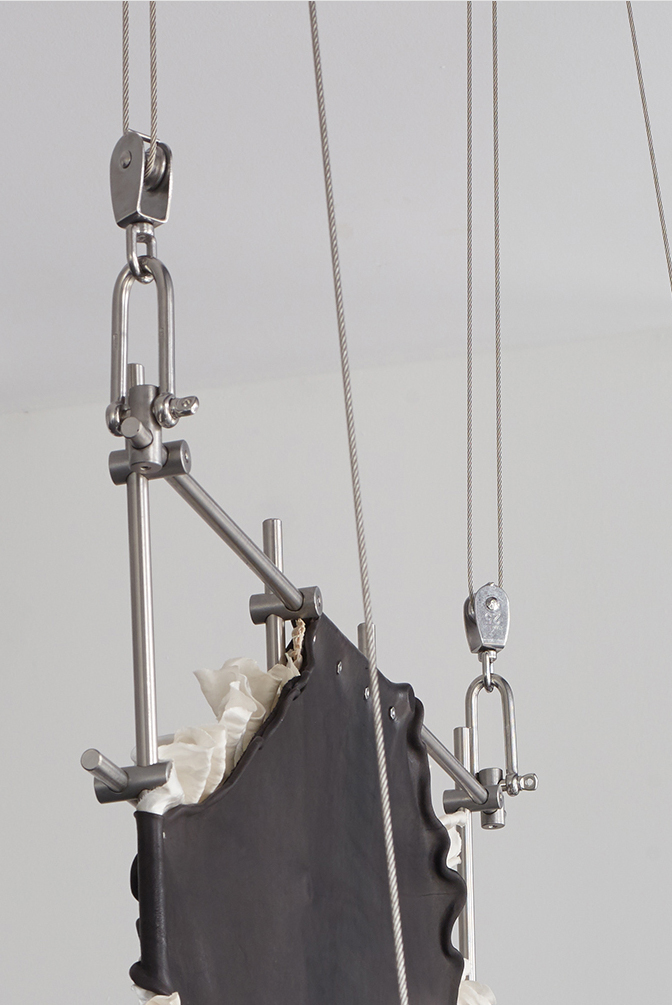 The sculptures of New York-based artist Elaine Cameron-Weir (* 1985 in Alberta, Canada) combine natural materials like minerals, incense and shells with handmade elements and industrial objects. Light blue glowing neon lights, metallic tables, mirrors and utensils from the medical and science industry as well as chainmail protective shirts and tanned leather evoke in interaction a laboratory for experiments. Accompanied by symbols like the parachute or the snake, which stands through its ability to molt for regeneration and renewal, she fuses organic with technoid, industrial and inanimate materials.
