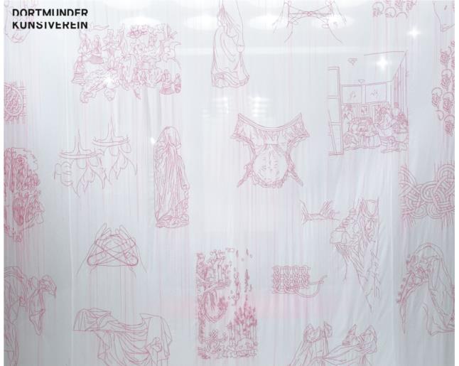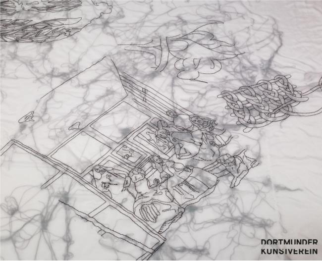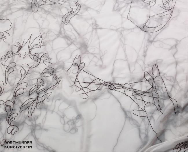 Die Textilobjekte und -installationen der Japanerin Aiko Tezuka widmen sich der Kunst- und Textilgeschichte. Sie stickt allgemein vertraute und fremde Motive auf gekaufte Textilien oder trennt in akribischer Handarbeit industriell gefertigte, aber auch von ihr selbst designte Stoffe in einzelne Fäden auf. In neueren Arbeiten verwebt sie bekannte Bilder, wie Zitate aus der Kunstgeschichte, sowie traditionelle Ornamente mit Alltagssymbolen, wie Lebensmittelsiegeln oder dem Recycling-Zeichen. So hinterfragt sie Symbole, Muster und Stoffe nach ihrer kulturellen Zeugenschaft. Diese Dekonstruktion ist stets auch ein Akt der Rekonstruktion, mit der sie uns die Geschichte hinter ihren Werken als in Stoff verwobene Erinnerungen offenbart.