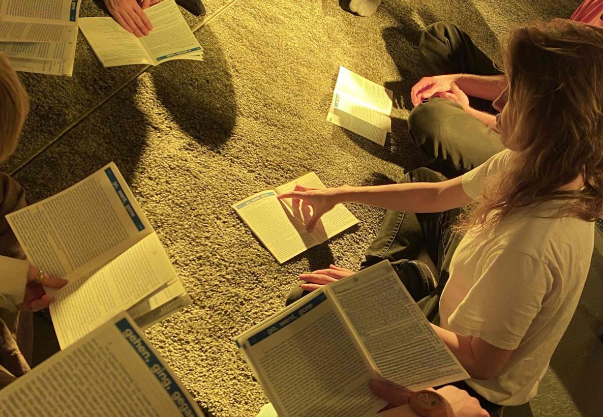 During the Slow Reading Club, a collective physical experience is created in thematic coordination with the exhibitions: with various instructions for action, the audience reads together through a selection of found texts from prose, poetry, and theory. Lighting mood, sound and a special spatial setting also create an artificial, immersive situation. The goal is not so much to decipher or fundamentally understand the texts, but to create a pretext for engaging with texts together: Skin over sentence structure and flesh against flesh.