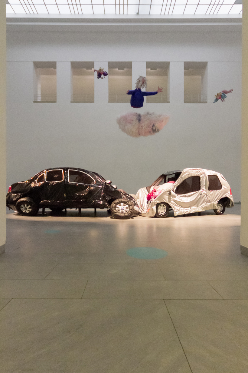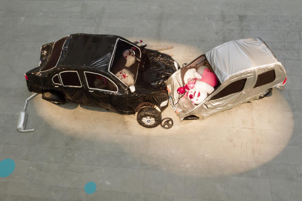 Justyna Koeke's Car Accident - sewn from soft materials - alludes to a child's fascination with disasters, which carries an intuitive urge to confront fears and themes of transience. Two artists designed a model made of building blocks: Hubert Czerepok's Little Boy presents a model of an atomic bomb that you can assemble yourself, and Aleksandra Polisiewicz's Kingdom of United Colors is a foam puzzle that refers to the phenomenon of multiculturalism and the fascination with mathematical infinity. Zorka Wollny's journey was conceived in the form of a labyrinth and represents a metaphor for growing up. Angelika Markul's Temptation also stems from a childhood memory of getting lost in a cornfield. The space she creates, in which one loses all sense of time and place, is completely filled with green mist. The audience's reactions to this are completely contradictory: they range from a feeling of fascination to that of total loneliness. Olaf Brzeski's installation Drowning is inspired by a toy from the artist's childhood and deals with the phenomenon of our memories prismatically deformed and filtered by time.