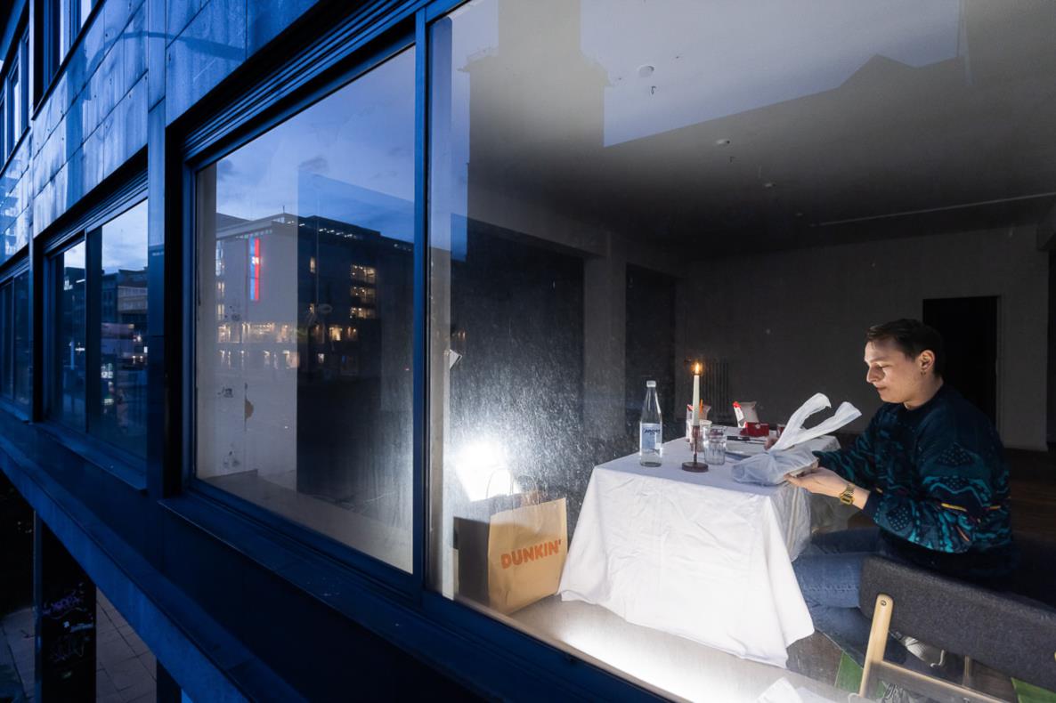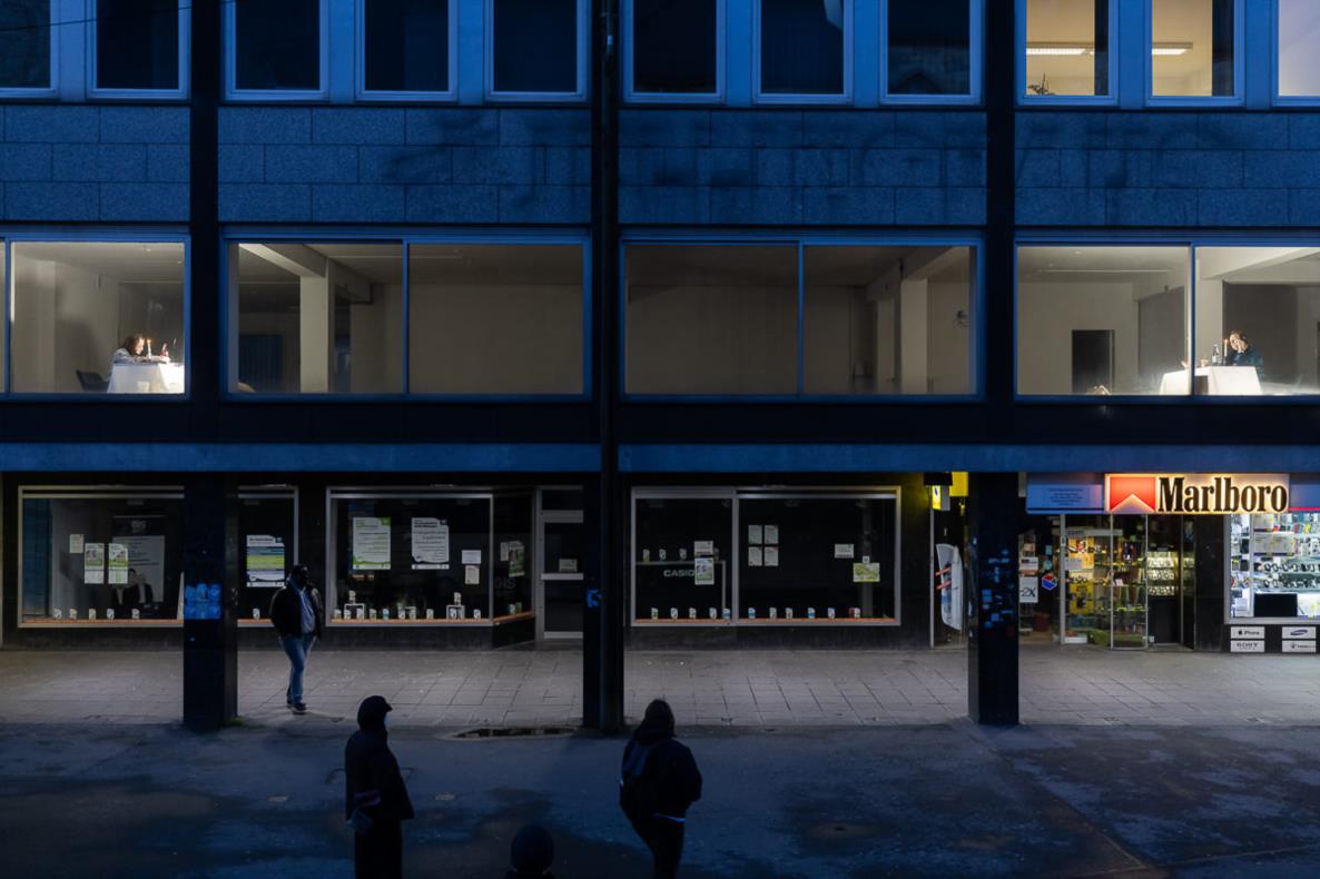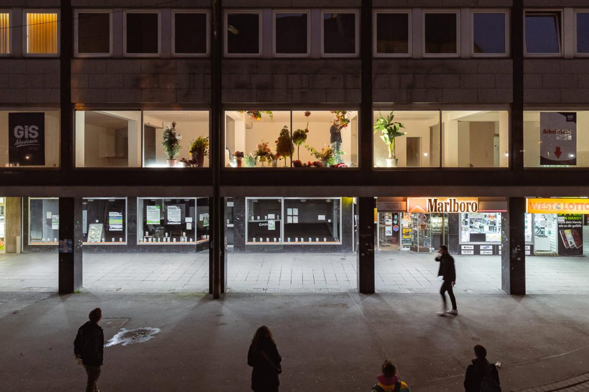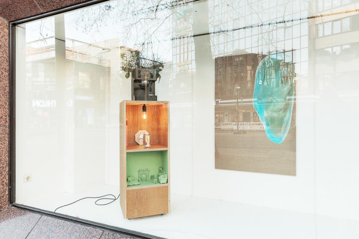 The Dortmund collective Salon Atelier consists of visual artists, musicians, and actors. Together, they create silent scenes of everyday life for a two-hour city walk each weekend. Their works function as tableaux vivants (living pictures), reminding us of various actions that have become partly foreign to us in the pandemic. They are presented on the second floor behind the shop windows and play with alienation and familiarity, with closeness and distance.