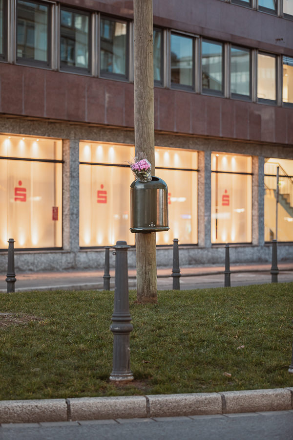 The work Guilty Flowers by the artist collective FORT is installed at the teardrop-shaped, roundabout in front of the Savings Bank. A wrapped bouquet of flowers in the trash lays the trail to a narrative, a micro drama of everyday life whose protagonists are no longer present. This creates a tension between the sculptural gesture and the questions arising from the strong narrative image.