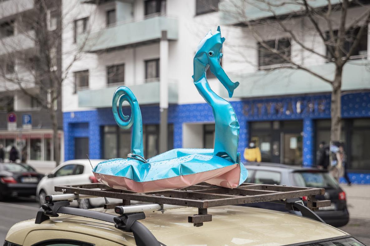 The Daihatsu Rooftop Gallery is a mobile exhibition display for contemporary art. Since March 2020, Peter Fritzenwallner has used it to make sculptures that would otherwise only be seen in art spaces, allowing for public visibility, even in times of social distancing. Initially on the road in the Austrian Alps, the yellow car roof gallery first brought art to the villages and then to the capital in Vienna. And now: Dortmund! There might be no beach under the pavement here, but there are plenty of opportunities for escapism!