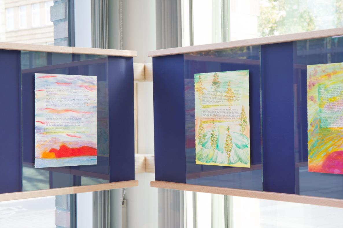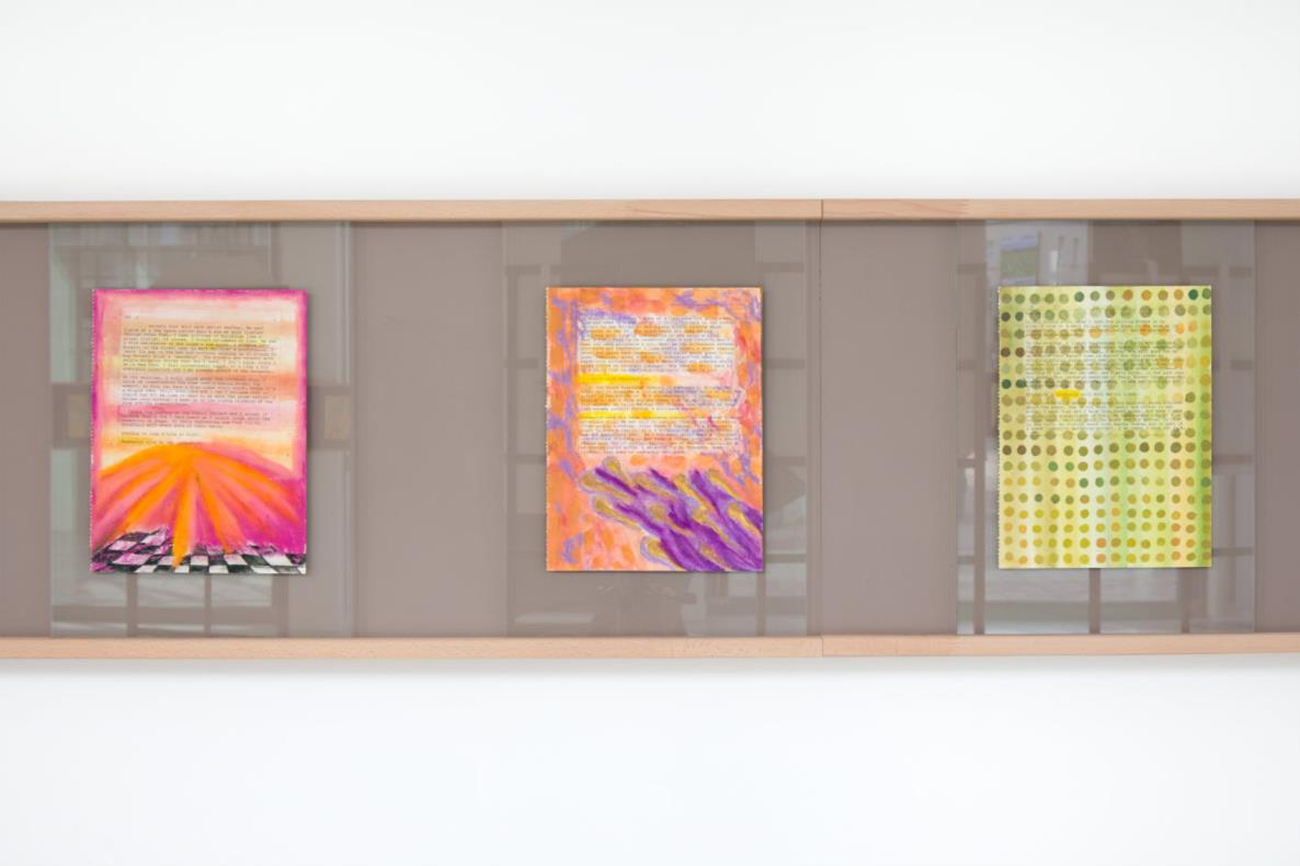 For the exhibition Obsession Abt has created three new groups of works in which she reveals her passion for literature, film, advertisement graphics, consumption and the works of other artists. She transforms painting and diary texts into collages, comments on them, reworks and alienates them. It is a process of self-editing in which fiction ultimately outgrows and challenges real life experiences.