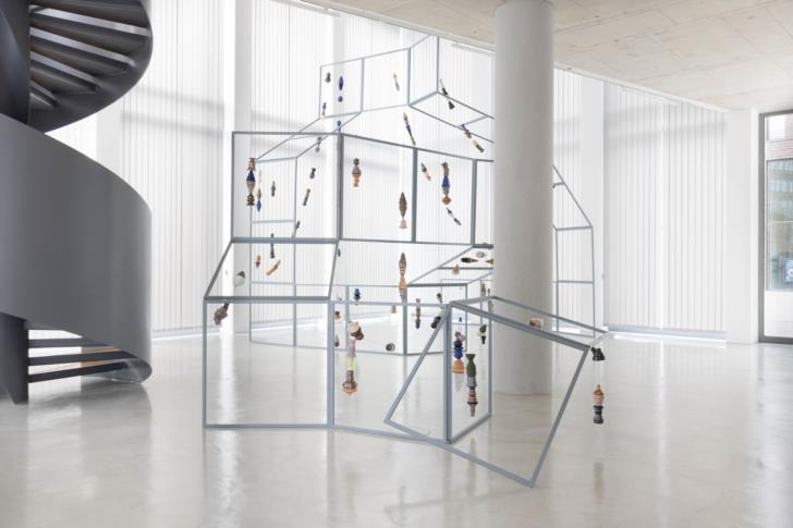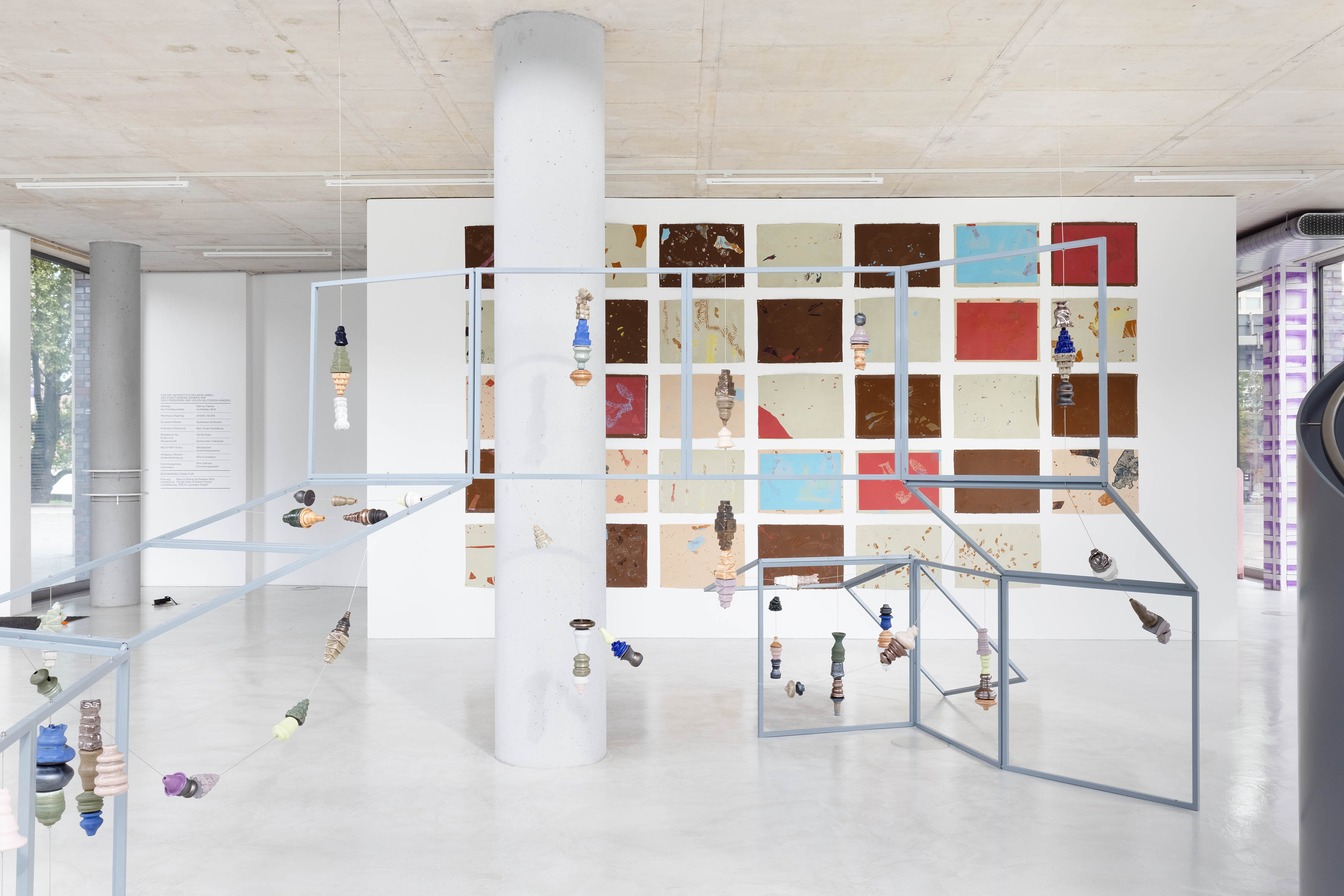 In her exhibition Stringing Beads, she presents new drawings and ceramics that reflect on the fragility and instability of human existence: handmade ceramic beads, threaded into a meandering, modular architecture, draw parallels between craft techniques and narrative processes. The artist contrasts this linear experience of time with the rotating movement of the potter's wheel: history both progresses and repeats itself. Her installation thus creates its own cosmos, addressing interruptions and breaks in the transmission of history and—as in the Tower of Babel—the cycles of construction, collapse, and reconstruction.